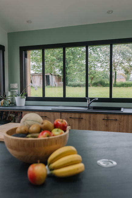 En achetant cette longère en périphérie de Rennes, S. et C. ont tout de suite eu envie de l’ouvrir vers le jardin. Ils ont fait appel à l’Atelier Fraleux pour dessiner et créer une extension qui accueille aujourd’hui la cuisine. Avec toutes ses ouvertures dont cette grande fenêtre bandeau, le nouveau volume vient apporter la lumière qu’il manquait à la pièce de vie et la touche moderne qui remet cette maison ancienne au goût du jour. À l’extérieur, l’enduit beige et la toiture en zinc se marient parfaitement avec la maison existante. S. et C. ont également fait confiance à l’Atelier Fraleux pour le choix des artisans et le suivi de chantier.