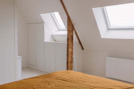 Dès qu’ils ont acheté leur maison dans le quartier du Ter à Lorient, A. et C. ont vu le potentiel des combles. Après avoir rénové eux-mêmes le rez-de-chaussée et le premier étage, ils ont confié à l’Atelier Fraleux l’aménagement de ce plateau resté brut : environ 80m2 au sol sur plancher béton et une magnifique hauteur de plus de 6m sous faîtage. Nous y avons aménagé une suite parentale, un bureau ainsi qu’une salle de jeu. Une trémie a été créée dans le plancher béton pour accueillir le nouvel escalier. La salle de bain et le dressing ont été plafonnés à 2m70 alors que les autres pièces jouissent d’une hauteur de presque 4m. Des fenêtres de toit dont une verrière ont été créées dans la toiture pour bénéficier d’un bel apport de lumière. La mission complète (projet et suivi de chantier) a été réalisée par l’Atelier Fraleux.